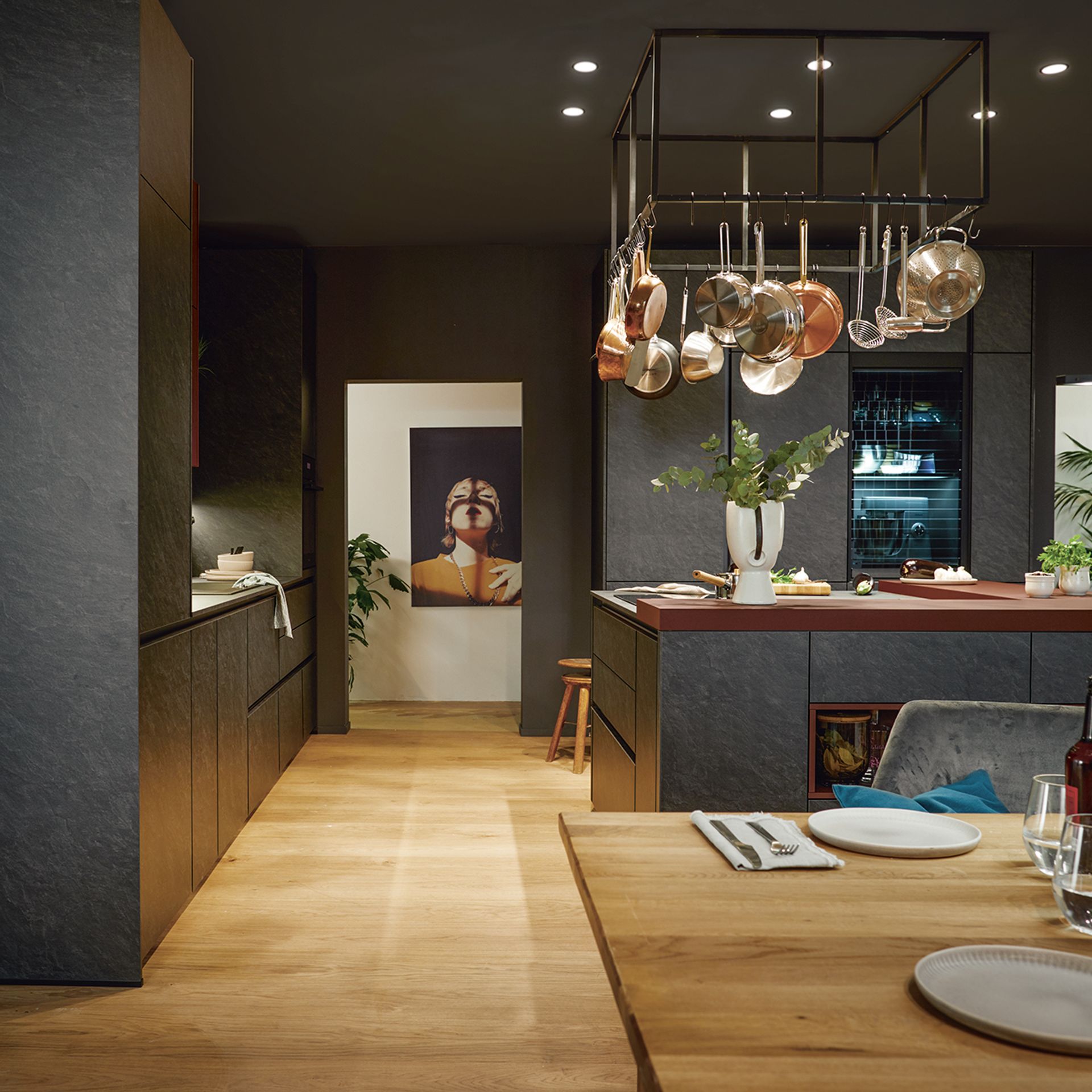 Wie sieht die Küche in den 2020-er Jahren aus? Eines ist klar: Sie ist offen für Neues. Offenes Wohnen ist so aktuell wie nie zuvor, und die einzelnen Lebensbereiche verschwimmen. In der Küche wird gearbeitet, gustiert und gekostet, auch gegessen, gechillt und verweilt. Das nicht mehr so wie vor einigen Jahren meist in klinischem Weiß, sondern in eher dunkleren Tönen. Dabei reicht der Bogen von Anthrazit über Mitternachtsblau und Tannengrün bis zu dunklen Hölzern, in die sich immer wieder ein neuer, leichter Rosé Ton mischt und für frischen Wind sorgt. Diese Farbwelt ist oft matt, in Anti-Fingerprint Optik, meist grifflos und mit vielen praktischen Details gespickt. Es gibt unzählige Varianten, um typische Küchenhelfer verschwinden zu lassen, die dann mit einem Handgriff sofort parat sind. Die Zeiten, in denen die Küche offensichtlich mit ihren technischen Hilfsmitteln geprahlt hat, sind Schnee von gestern. Alle Linien sind klar und puristisch. Die Küche beeindruckt als stylishes Designmöbel und Blickfang zugleich.