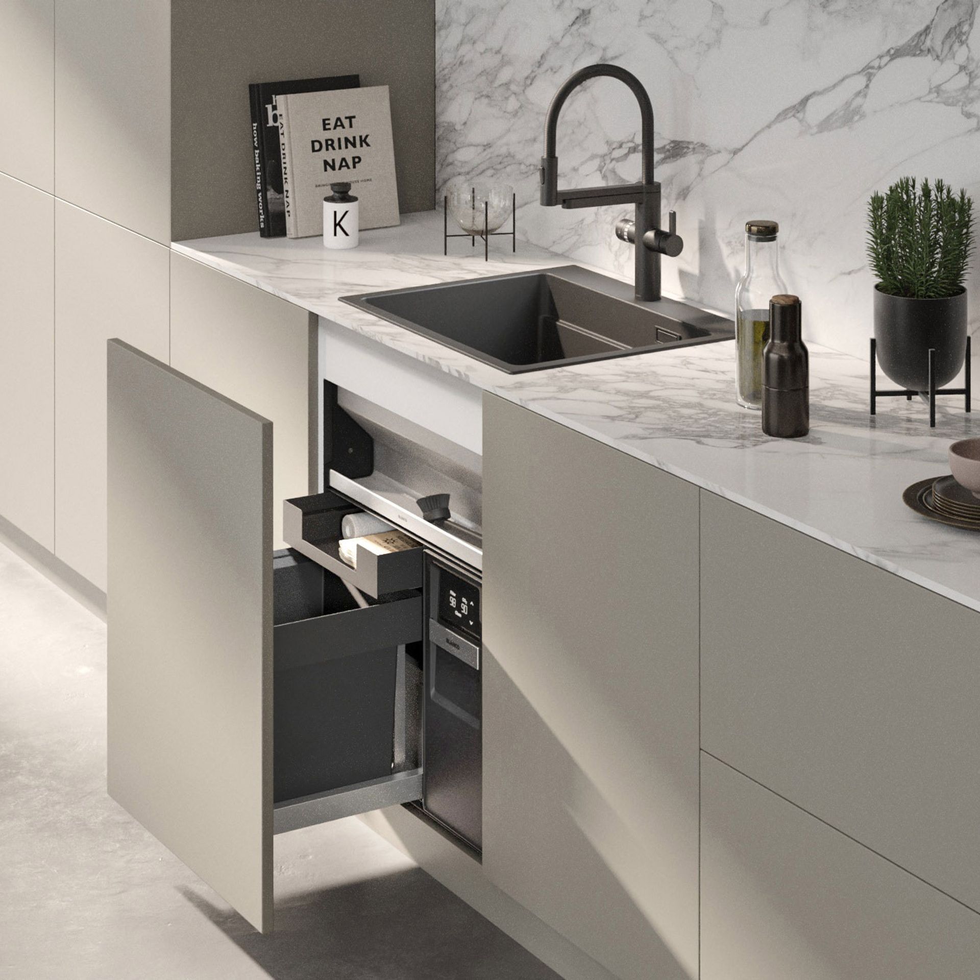Profi-Tipp von Belfin: In der Küche geht es immer auch um Platz, Stauraum und darum, alles griffbereit zu haben. Clevere Lösungen schaffen Raum. Wenn Geschirrspüler, Küchenmaschinen oder andere technische Geräte intelligent angeordnet werden, kann jeder Winkel genutzt werden, was besonders in kleineren Küchen wichtig ist.